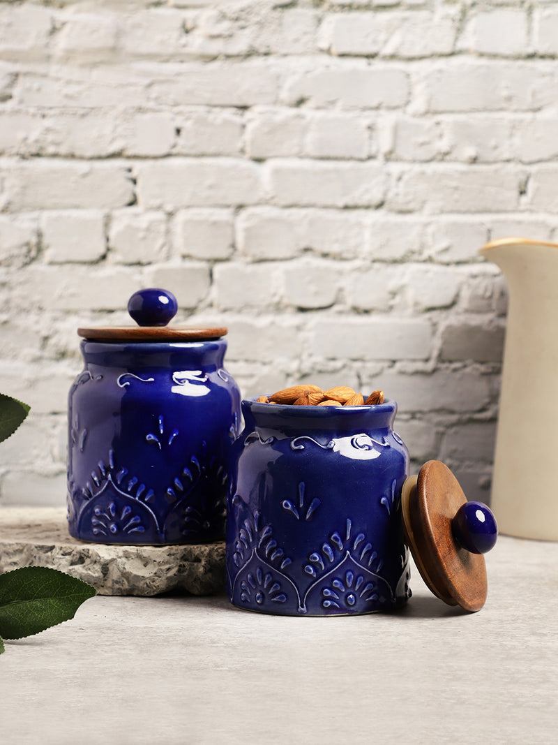 tVarEesha's ceramic collection is a bouquet of hand crafted ceramic tableware that highlight the patience and perseverance of skilled craftsmen across our cultural heritage. Each piece goes through the long process of clay baking, painting, shading, re-baking and glazing. Applause worthy is the effort that goes in replication of embossing, shading and fusion of colors making each of these pieces one of a kind. Every piece is pain- stakingly hand painted separately and thus may differ slightly from each other in size, color and shape. Blue Hand Painted Embossed Ceramic Air Tight Jars Set is a part of this range that has two jars measuring 8x10 Cm in dia x h. Each has a capacity of 500 ml and is suitable for pickles, chutneys or sauces, etc. The jars are convenient to handle and are washable at home.