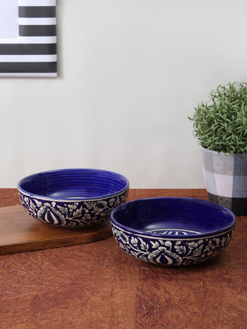 VarEesha presents the "Kaarigari" range of beautiful hand crafted ceramic dining accessories that showcase the magical handwork of Indian rural artisans. Each piece goes through the long process of clay baking, drawing, painting, re-baking and glazing. The pieces have contrasts, tones and intricate motifs & patterns that are inspired from the artist's creative design based on our rich cultural heritage. Every piece is painstakingly hand painted uniquely and thus may differ slightly from each other in size, color and shape. These are made at high temperatures and are microwave safe as well as lead free. Blue Mughal 7 Inch Ceramic Serving Bowls Set is part of this range that has two pieces each measuring 7x3.5 inches in diaxh and with a capacity of 700 ml.