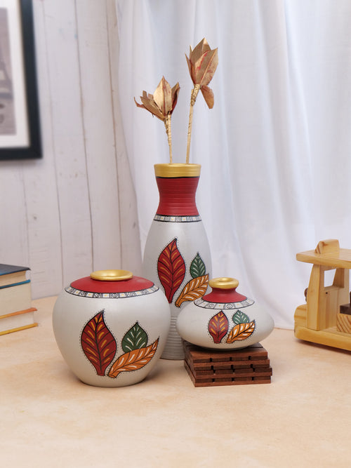 Paired with floral bouquets, this handpainted vase will take you close to nature. Our Red-leaf terracotta pot set of three has beautiful bright leaves printed on it with a grey and white background. The stunning range reminds you of the magical autumn season. It is an excellent gift for different occasions.