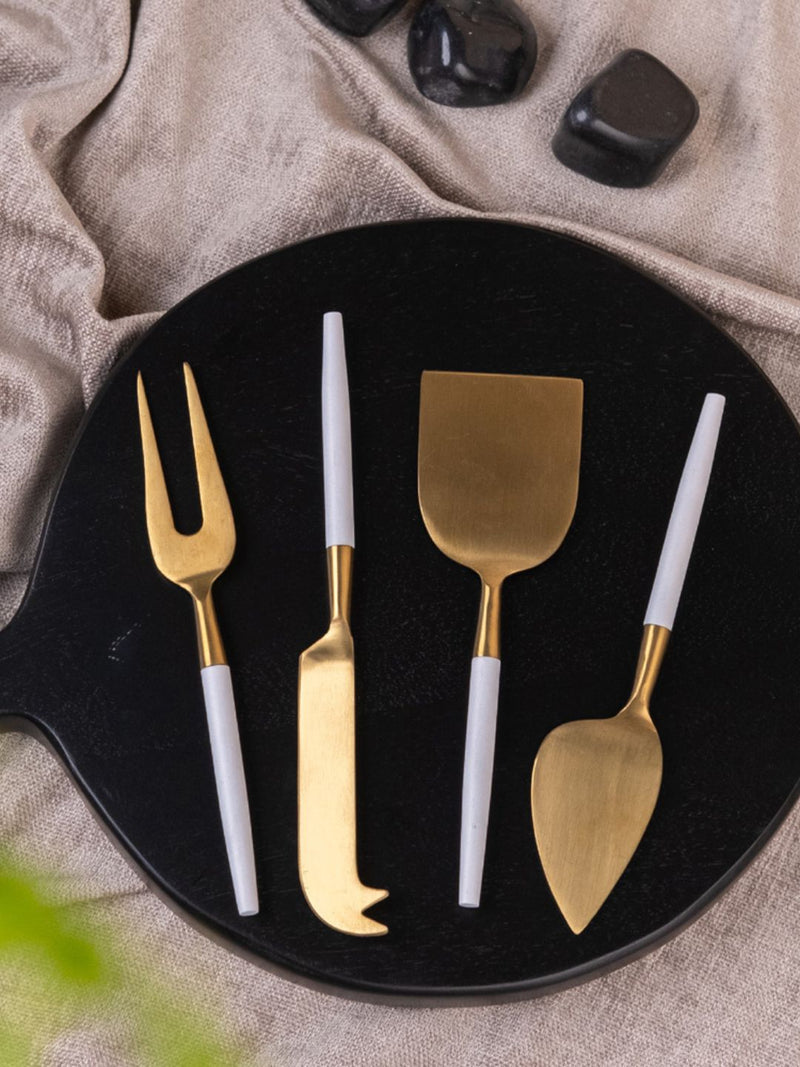 The dining table is a place where we nourish ourselves; where we come together, celebrate important milestones, share experiences, and create new understandings. Make this fulfilling experience even more beautiful, with VarEesha's Radiant range of silverware. This beautiful series has a number of impressive flatware and cutlery. These are made in matt finish stainless steel or electroplated gold with beautiful metallic shaded handles that give your home a very classy look. Easy to hold, these are rust proof and have been made with premium quality steel using electroplating. After use, wash them with soft sponge by hand as these are not dishwasher friendly. Radiant White Handle Gold Heads Cheese Knives Set from this series is not only sure to add that designer feel to your meal experiences, but is also a very unique and lovely gift item. Whether its a loved one's housewarming or a corporate gift occasion, these are just right. Pair them with other pieces from Radiant collection to complete the look.