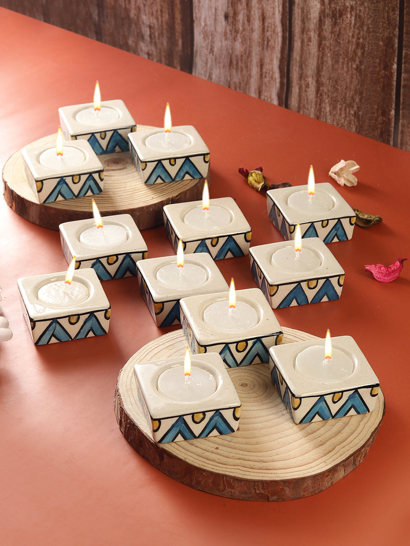A house is made of wall and beams; A home is built with love & dreams!! We all find our homes a safe haven, a comfortable sanctuary and we all like to decorate it as per our taste and comforts. A beautiful neat home brings peace and tranquility as well as ccheer and positive vibes.Tea Lights and diyas form an integral part of our Indian households, specially in the festive season. Ahead of the festive season, we bring forward this exclusive collection - Earthen Sparkle - of lanterns, lamps and diyas to light up not just your home but your spirits too. Vibrant shades and sweet quirky borders make this collection a very appealing one. Illuminate your room with Hand-made Blue Triangles with Yellow Square Ceramic Diyas Tea Light Holders from VarEesha. Made of ceramic, this is hand painted by rural artisans and can hold oil or a wax Tea Light in it. This set contains twelve hand-made off white hand painted ceramic tea light holders, each measuring 2.5x2.5x1 inches in lxbxh. Easy to maintain, this hand crafted diyas set can be wiped clean and then reused. A wonderful gift option, this set of tea light holders is sure to make the receiver glow with joy, whether its Diwali or housewarming.