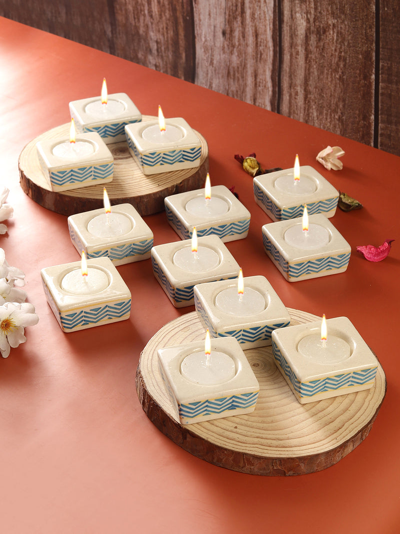 Blue Zigzag Square Ceramic Diyas/ Tea Light Holders 12 Pc Set