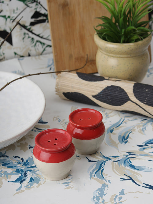 Enhance your tabletop with our salt n pepper holder The red-white handi ceramic set. It is handcrafted and is a tribute to rich Indian cultural heritage. Looks cute, like a button; it has two sprinklers with a plastic opening at the bottom.