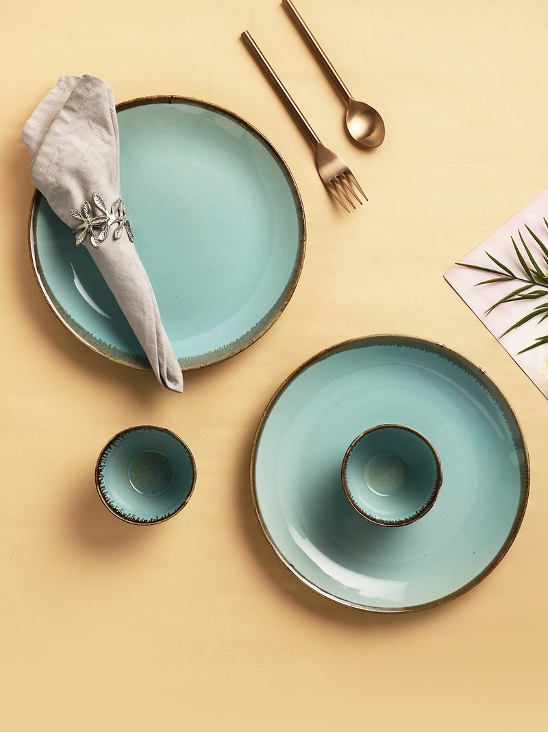 If anything is the most desired and the most sought after, in today’s world, it is peace and satisfaction. Each of us in today’s fast-moving world is looking for serenity, quiet and tranquillity. Imagine yourself in a hammock on the side of the ocean on a quiet day or sitting under a starry sky, listening to the crickets. The calmness and soothing feeling that such beautiful things in nature bring to us, inspired our latest collection – Tranquil Mint. Nature and its magical beauty are exhilarating for the mind, body, and soul. The soothing pastel shade of Mint invokes in you a feeling of deep quietude or composure. This beautiful shade also brings with it a class and style that is unmatched. VarEesha’s Tranquil Mint is an ode to elegance and peace. The series features a number of dining accessories, dinner ware and serve-ware that will enhance your home collection even more. Hand crafted and hand painted uniquely, each of the pieces tells a different tale. Embossing, painting, riveting and glazing, all techniques put together bring forward wonderful, lovely ceramic bowls, dishes and platters. Since each is hand painted, the shade, shape, pattern and border might differ from the image as seen on your desktops. But don’t worry, such imperfections just add to the beauty and authenticity of the piece. Each of these is microwave safe and dishwasher safe and also makes the perfect gift for special occasions like housewarming or anniversaries. Tranquil Mint Ceramic Small Dinner Set is a part of this beautiful series, that has two full plates and two veg bowls. Each plate measures 10x1 inches in diaxh and each bowl measures 3.5x2.5 inches in diaxh.