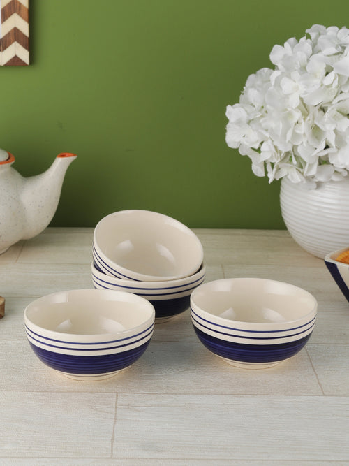 Nothing exudes royalty better than the royal crown blue ceramic veg bowls/katori set of four. These bowls pay homage to ancient royalty and have motifs and paintings inscribed. The tones, contrasts, and patterns add a charming effect to any dinner set-up. They are microwave-safe snack bowls.
