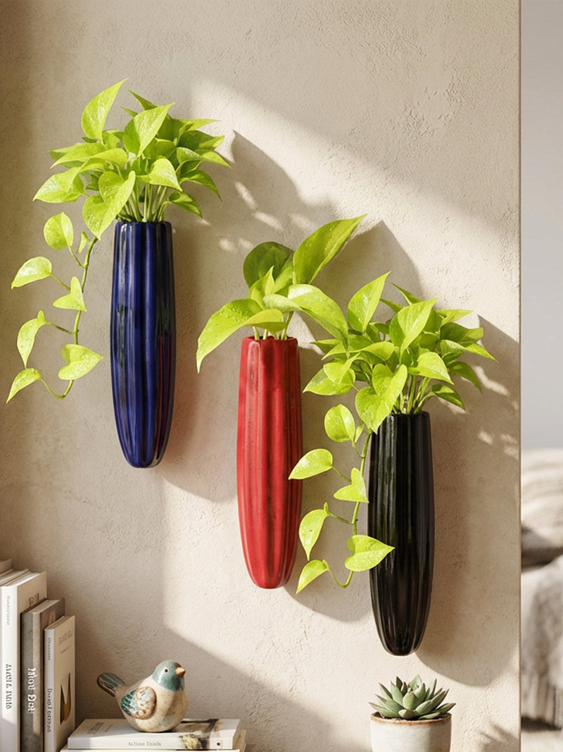 Having plants in your home helps to give the impression of a natural environment and a feeling of more space. An environment including natural elements and plants brings a positive outlook on life and boosts people into the feeling of relaxation and vitality. The scent of certain flowers can also help you feel more relaxed and happier in general. Keeping plants and flowers indoors always remains in style. Not only do indoor plants enhance the overall appearance of a space, but studies show they boost moods, increase creativity, reduce stress, and eliminate air pollutants?making for a healthier, happier you. People come up with initiatives and ideas every day to increase greenery around us. A similar initiative from VarEesha combining stylish decor and greenery is - GreenWall, a collection of contemporary shapes & natural colors ceramic planters. Each of these pieces is hand-made with premium ceramic and thus no two pieces are exactly alike. These can be put on any wall or dining space cheering up the whole room. In just two simple steps, the place can be brightened up. Just take a plant cutting, add some water to the planter and hang on your wall. Measuring 1.5x1.7x7 inches in lxbxh each, GreenWall Ethnic Blue, Red and Black Oval Ceramic Wall Planters Set is a part of this wonderful collection. Featuring a sleek design, this has three beautiful pieces in each color, that also form an excellent gifting option.