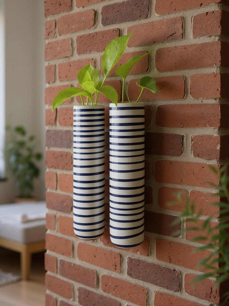 Having plants in your home helps to give the impression of a natural environment and a feeling of more space. An environment including natural elements and plants brings a positive outlook on life and boosts people into the feeling of relaxation and vitality. The scent of certain flowers can also help you feel more relaxed and happier in general. Keeping plants and flowers indoors always remains in style. Not only do indoor plants enhance the overall appearance of a space, but studies show they boost moods, increase creativity, reduce stress, and eliminate air pollutants?making for a healthier, happier you. People come up with initiatives and ideas every day to increase greenery around us. A similar initiative from VarEesha combining stylish decor and greenery is - GreenWall, a collection of contemporary shapes & natural colors ceramic planters. Each of these pieces is hand-made with premium ceramic and thus no two pieces are exactly alike. These can be put on any wall or dining space cheering up the whole room. In just two simple steps, the place can be brightened up. Just take a plant cutting, add some water to the planter and hang on your wall. Measuring 1.5x1.7x7 inches in lxbxh each, GreenWall Blue Spiral Ceramic Wall Planters Set is a part of this wonderful collection. Featuring Hand painted blue stripes on offwhite base, this has two beautiful pieces that also form an excellent gifting option.