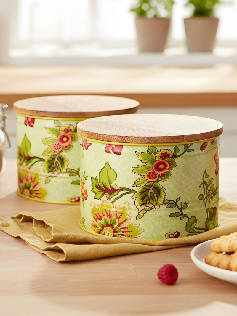 Upgrade your kitchen organization with this beautifully crafted Rooted Living airtight storage container series, designed to combine functionality with timeless style. Perfect for modern and traditional kitchens alike, these containers are ideal for storing everyday essentials while adding a decorative touch to your countertop or shelf. Made from powder-coated galvanized iron using food-safe colors, the containers are durable, rust-resistant, and safe for storing dry food items. The smooth, high-quality finish ensures long-lasting use while maintaining its elegant appearance. Each container is topped with a natural mango wood lid, fitted to create an airtight seal that helps keep contents fresh for longer by protecting them from moisture and air exposure. With a 500 ml capacity, this container is suitable for storing tea, coffee, sugar, cookies, dry snacks, spices, lentils, nuts, or other kitchen essentials. Please note: capacity in grams may vary depending on the type and density of the stored item. Stylish, practical, and versatile, Beige Floral Printed Airtight Metal Containers Set is a perfect addition to your kitchen or a thoughtful gift for housewarmings, weddings, or festive occasions. The set contains two containers measuring 11x8 CM each.