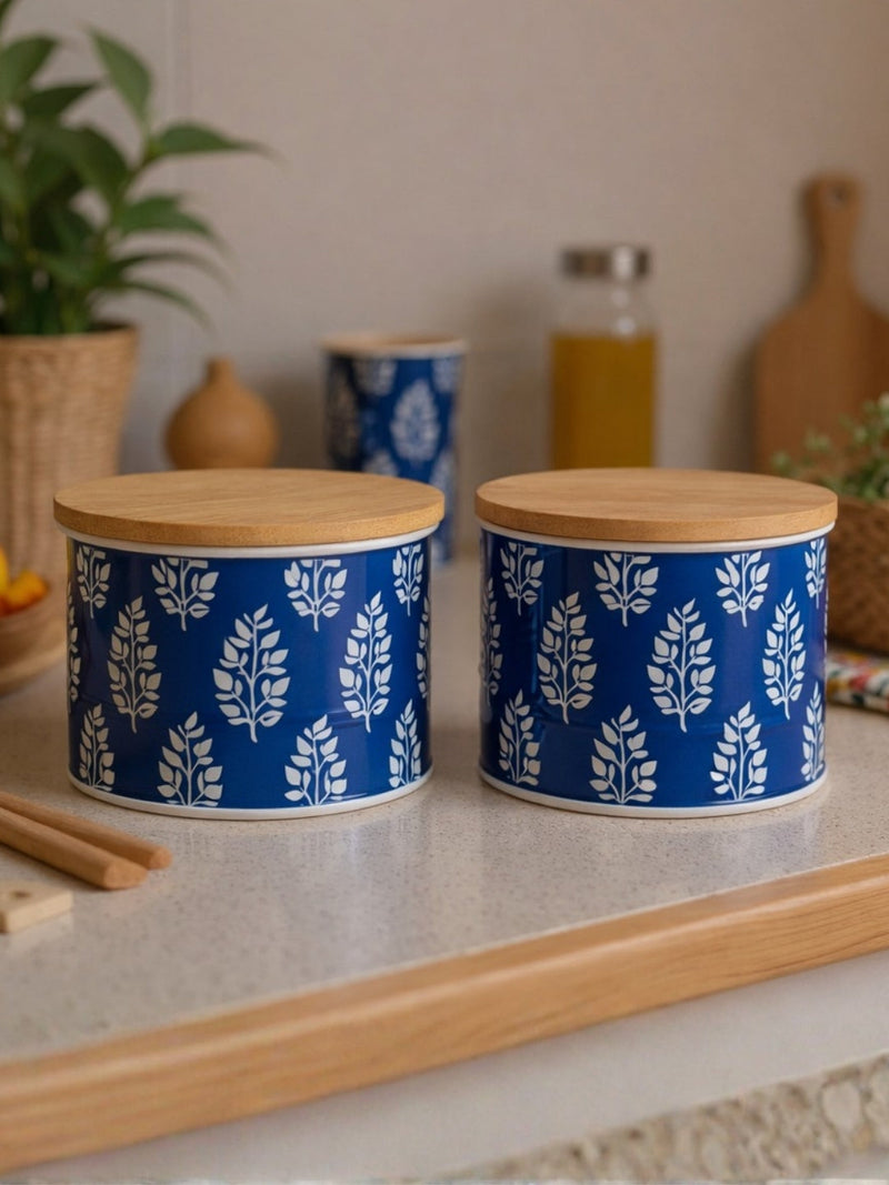 Upgrade your kitchen organization with this beautifully crafted Rooted Living airtight storage container series, designed to combine functionality with timeless style. Perfect for modern and traditional kitchens alike, these containers are ideal for storing everyday essentials while adding a decorative touch to your countertop or shelf. Made from powder-coated galvanized iron using food-safe colors, the containers are durable, rust-resistant, and safe for storing dry food items. The smooth, high-quality finish ensures long-lasting use while maintaining its elegant appearance. Each container is topped with a natural mango wood lid, fitted to create an airtight seal that helps keep contents fresh for longer by protecting them from moisture and air exposure.With a 500 ml capacity, this container is suitable for storing tea, coffee, sugar, cookies, dry snacks, spices, lentils, nuts, or other kitchen essentials. Please note: capacity in grams may vary depending on the type and density of the stored item. Stylish, practical, and versatile, Blue White Paisley Leaf Printed Airtight Metal Containers Set is a perfect addition to your kitchen or a thoughtful gift for housewarmings, weddings, or festive occasions. The set contains two containers measuring 11x8 CM each.