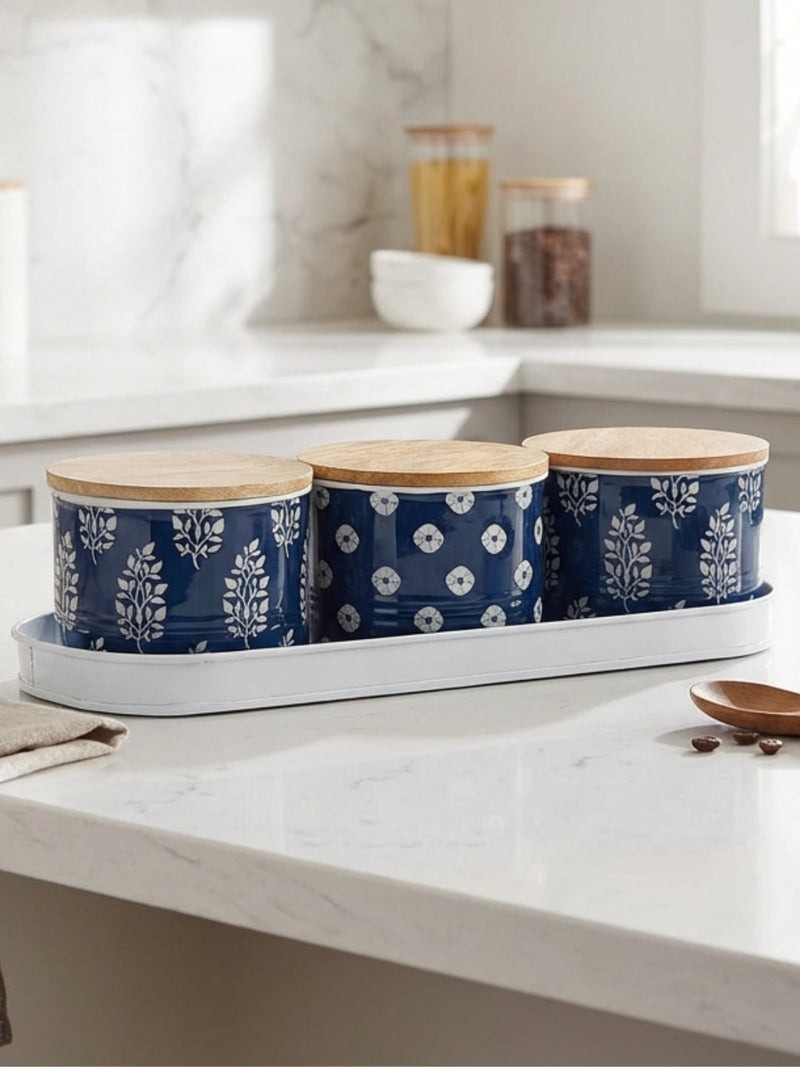 Blue White Printed Airtight Metal 3 Pc Containers Set with White Metal Tray