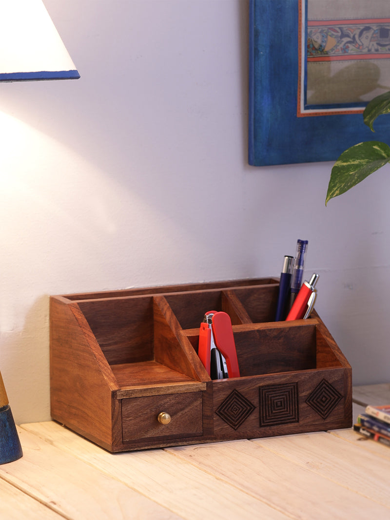Geomtetric Design Sheesham Wood Pen Holder cum Desk Organiser