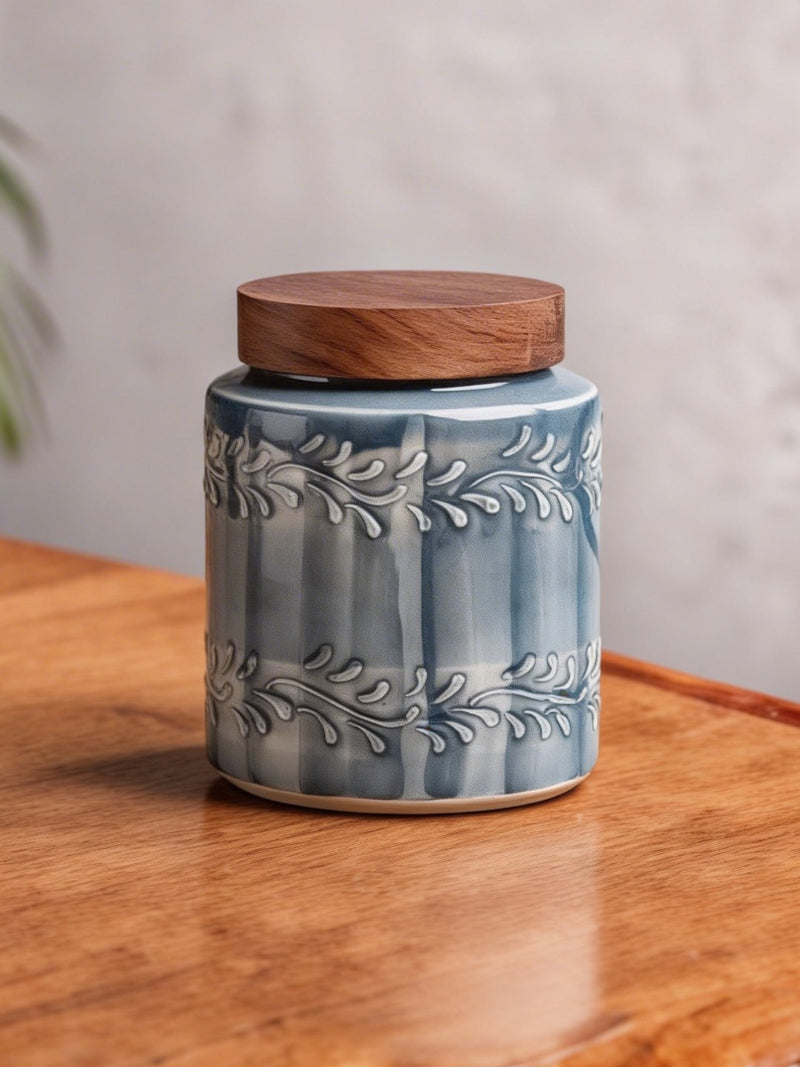 Grey Embossed Ceramic Air Tight Jar with Wooden Lid