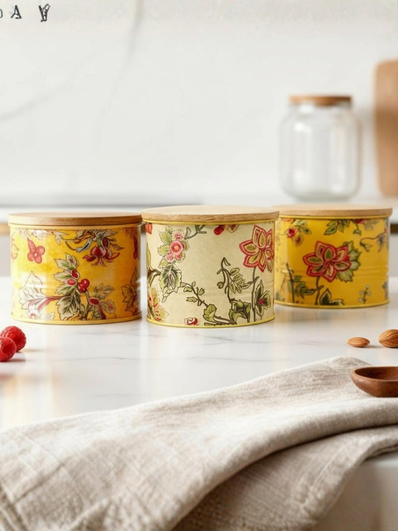 Upgrade your kitchen organization with this beautifully crafted Rooted Living airtight storage container series, designed to combine functionality with timeless style. Perfect for modern and traditional kitchens alike, these containers are ideal for storing everyday essentials while adding a decorative touch to your countertop or shelf. Made from powder-coated galvanized iron using food-safe colors, the containers are durable, rust-resistant, and safe for storing dry food items. The smooth, high-quality finish ensures long-lasting use while maintaining its elegant appearance. Each container is topped with a natural mango wood lid, fitted to create an airtight seal that helps keep contents fresh for longer by protecting them from moisture and air exposure. With a 500 ml capacity, this container is suitable for storing tea, coffee, sugar, cookies, dry snacks, spices, lentils, nuts, or other kitchen essentials. Please note: capacity in grams may vary depending on the type and density of the stored item. Stylish, practical, and versatile, Yellow and Beige Floral Printed Airtight Metal Containers Set is a perfect addition to your kitchen or a thoughtful gift for housewarmings, weddings, or festive occasions. The set contains three containers measuring 11x8 CM each.